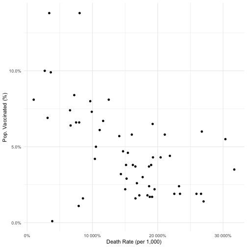 name: What is a neighborhood? class: left, bottom, inverse background-image: url(images/02_1_anastasia-dulgier-OKOOGO578eo-unsplash.jpg) background-size: cover # Neighborhood Analysis .font-35[Session 2: What is a Neighborhood?] ??? Today, we're going to spend more time getting to know one another, digging into some of our assumptions about what neighborhoods are, and exploring a bit of our judgements regarding what makes a neighborhood good or bad. Let's start by introducing ourselves... --- name: Your Turn class: right, middle background-image: url(images/bruno-aguirre-sHP3l9iMM30-unsplash-2.jpg) background-size: cover # Its your turn to share... --- name: Your Turn 2 class: right, middle background-image: url(images/bruno-aguirre-sHP3l9iMM30-unsplash-2.jpg) background-size: cover #<br> # Who are you? # Where is home? # What do you do here? # What types of stories <br>do you hope to tell? --- name: Last Class Whats a Neighborhood class: top, left .pull-left[ <img src="images/4_Farr_NeighUnit.jpg" width="100%" /> ] .font-35[.pull-right[ In our last session, you articulated qualities of neighborhoods... - A space to live in and interact - Sense of place - Distinct boundaries - Overlap of neighborhood and community - Overlapping dimensions - Living organism - complex adaptive system - Functional unit for value capture ] ] --- name: Question 1 - Good or Bad class: top, right background-image: url(images/02_5_pawel-czerwinski-T1ZIQDUjwiY-unsplash.jpg) background-size: cover # What makes a neighborhood <br>.salt[good] or .heat[bad]? --- name: Question 2 - APA Places class: top, right background-image: url(images/meghan-schiereck-REgC5GZEXU4-unsplash.jpg) background-size: cover # Are APA Great Places <br>.heat[biased?] --- name: Question 4 - Gentrification class: top, inverse background-image: url(images/02_2_fernando-hernandez-zQzaErgqAmY-unsplash.jpg) background-size: cover # .fat[Gentrification] <br> What is it? -- # How should <br>we measure it? -- # Let's explore a <br>bit more... --- name: pause for covid class: top, left # A Tweet sparks a question... .pull-left[ <img src="images/CDPH_Tweet.png" width="83%" /> ] .pull-right[ .font-35[ Sorry to bring COVID into this... What demographic factors help to explain the difference between where people are dying and where vaccinations are occurring? ] ] --- name: Get Data class: top, left <img src="images/chi_portal_covid.png" width="100%" /> --- name: Get Data 2 class: top, left <img src="images/chi_portal_covid_2.png" width="100%" /> --- name: Get Data 3 class: top, left <img src="images/chi_portal_covid_3.png" width="100%" /> --- name: Scatterplot COVID Infection Rate class: top, left .font-35[What's the relationship between COVID *cases* and vaccinations?] .pull-left[ .panelset[ .panel[.panel-name[Output] <!-- --> ] .panel[.panel-name[Code] ```r ggplot(dataset %>% filter(percent_tested_positive_cumulative !=0)) + geom_point(aes(x=percent_tested_positive_cumulative, y=X_1st_dose_percent_population))+ labs(x="Pop. Positive (%)", y="Pop. Vaccinated (%)")+ scale_x_continuous(labels=scales::percent)+ scale_y_continuous(labels=scales::percent)+ theme_minimal() ``` ] ] ] .pull-right[ How would you describe this in your own words? - What does each point represent? - Are the scales for X and Y reasonable? What do they tell you? - Is there a particular region on this plot that might spark questions for further exploration? - Are you ready to write an op-ed for the Chicago Tribune or Sun Times (the two major newspapers)? ] --- name: Scatterplot death rate class: top, left .font-35[What's the relationship between COVID *deaths* and vaccinations?] .pull-left[ .panelset[ .panel[.panel-name[Output] <!-- --> ] .panel[.panel-name[Code] ```r ggplot(dataset %>% filter(percent_tested_positive_cumulative !=0)) + geom_point(aes(x=death_rate_cumulative, y=X_1st_dose_percent_population))+ labs(x="Death Rate (per 1,000)", y="Pop. Vaccinated (%)")+ scale_x_continuous(labels=scales::percent)+ scale_y_continuous(labels=scales::percent)+ theme_minimal() ``` ] ] ] .pull-right[ How would you describe this in your own words? - What does each point represent? - Are the scales for X and Y reasonable? What do they tell you? - Is there a particular region on this plot that might spark questions for further exploration? - Are you ready to write an op-ed for the Chicago Tribune or Sun Times (the two major newspapers)? ] --- name: Maps class: top, left .pull-left[ .panelset[ .panel[.panel-name[Output] <!-- --> ] .panel[.panel-name[Code] ```r ggplot() + geom_sf(data=dataset, aes(fill=percent_tested_positive_cumulative))+ scale_fill_continuous(trans = 'reverse')+ geom_sf(data=chi, colour="gray40", fill=NA)+ labs(fill="Pop. Positive (%)")+ theme_minimal() ``` ] ]] .pull-right[ .panelset[ .panel[.panel-name[Output] <!-- --> ] .panel[.panel-name[Code] ```r ggplot() + geom_sf(data=dataset, aes(fill=X_1st_dose_percent_population))+ scale_fill_continuous(trans = 'reverse')+ geom_sf(data=chi, colour="gray40", fill=NA)+ labs(fill="Pop. Vaccinated (%)")+ theme_minimal() ``` ] ] ] --- name: Maps2 class: top, left .pull-left[ .panelset[ .panel[.panel-name[Output] <!-- --> ] .panel[.panel-name[Code] ```r ggplot() + geom_sf(data=dataset, aes(fill=death_rate_cumulative))+ scale_fill_continuous(trans = 'reverse')+ geom_sf(data=chi, colour="gray40", fill=NA)+ labs(fill="Pop. Died (%)")+ theme_minimal() ``` ] ]] .pull-right[ .panelset[ .panel[.panel-name[Output] <!-- --> ] .panel[.panel-name[Code] ```r ggplot() + geom_sf(data=dataset, aes(fill=X_1st_dose_percent_population))+ scale_fill_continuous(trans = 'reverse')+ geom_sf(data=chi, colour="gray40", fill=NA)+ labs(fill="Pop. Vaccinated (%)")+ theme_minimal() ``` ] ] ] --- name: What Next? class: bottom, left background-image: url(images/kelly-sikkema-cXkrqY2wFyc-unsplash.jpg) background-size: cover ### .salt[What Next?] .font-35[ What are the types of things you would want to <br>explore to understand what's going on here? Where might the inform